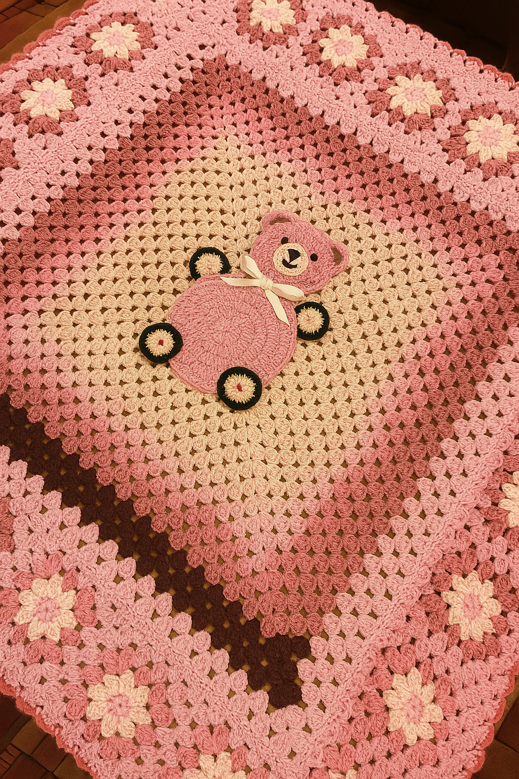 The blanket is worked in three stages: first you create the smaller border squares, then the large center square, and finally join everything together. The teddy bear appliqué is crafted separately and sewn onto the middle of the blanket as the finishing touch. The result is a timeless piece that can be passed down through generations.